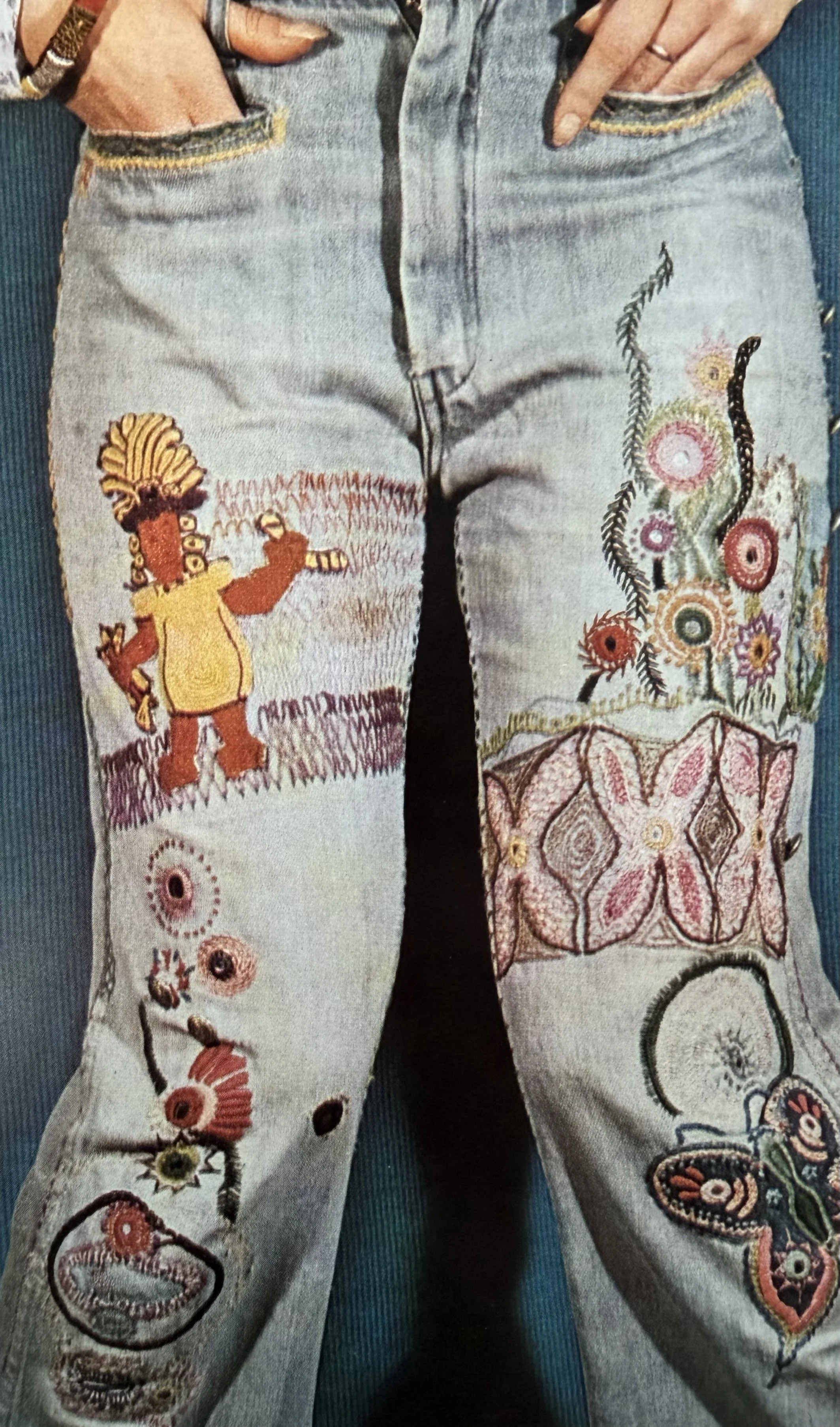 Embroidered jeans in Native Funk & Flash (1974).